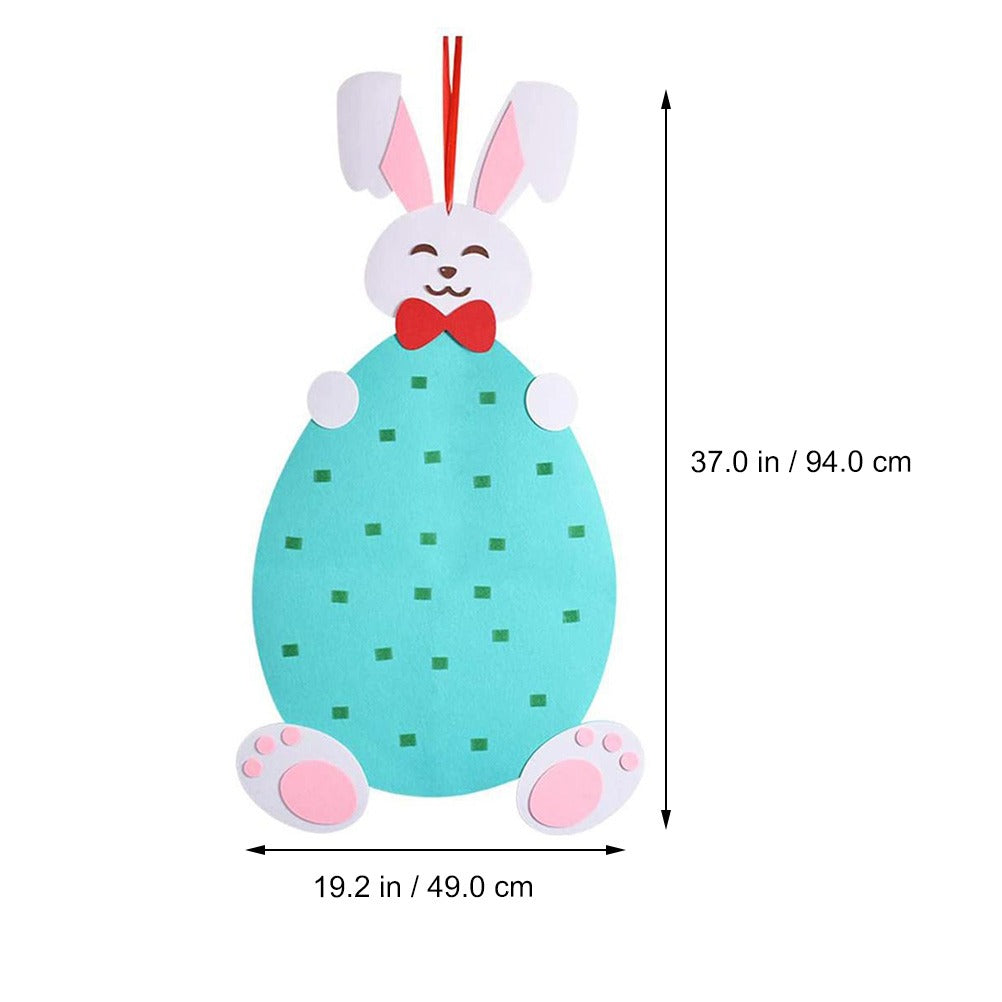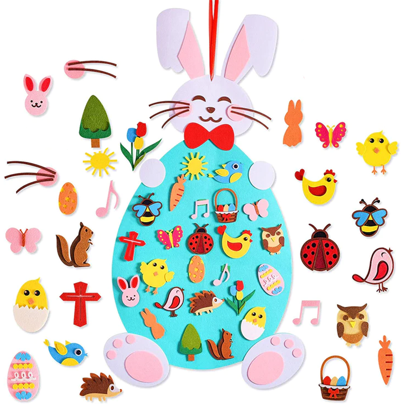 Das Set enthält einen weichen und knuddeligen Filzhasen als Mittelpunkt, zusammen mit einer Vielzahl von Filzteilen wie bunte Eier, Körbchen und andere osterthematische Dekorationen.