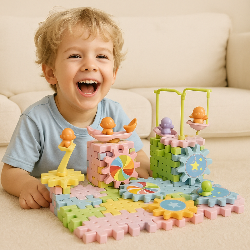 Die großen Puzzlestücke machen es super einfach für kleine Hände, sicher zu bauen und zu erkunden. Egal, ob sie Blöcke verbinden oder ein drehendes Zahnrad hinzufügen, jeder Moment fühlt sich lohnend an. Eltern lieben es, wie Zahnrad die Kinder stundenlang fokussiert und unterhalten hält, fern von Bildschirmen und voller Kreativität.
