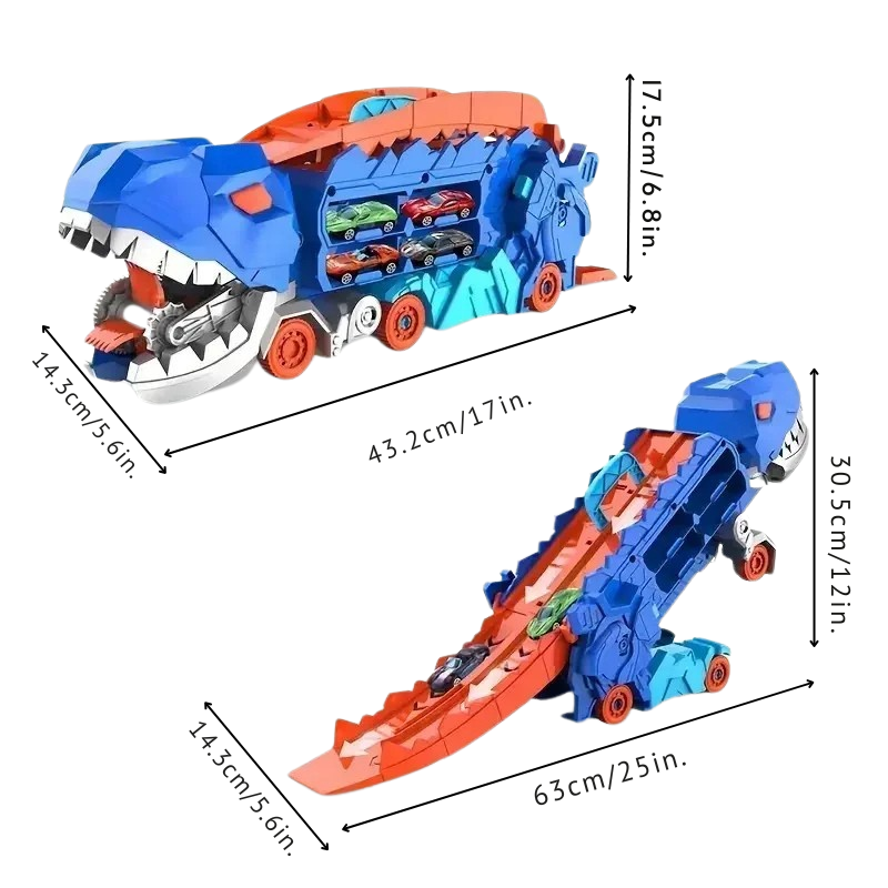 RennRex ist mehr als nur ein Transporter – er ist ein wandelbares Actionwunder. Heute ein cooler Autotruck, morgen ein furchteinflößender Dino, der kleine Flitzer verschlingt und sie über die zweispurige Bahn sausen lässt. Mit Platz für bis zu 16 Mini-Autos und einem Launcher für packende Duelle bietet RennRex unendlich viele Spielmöglichkeiten – allein oder mit Freunden.