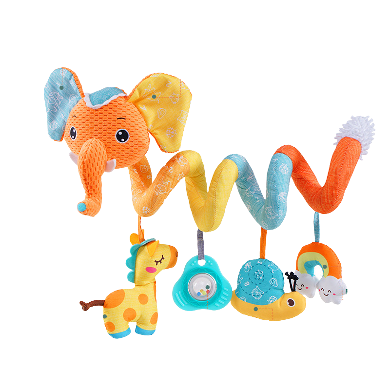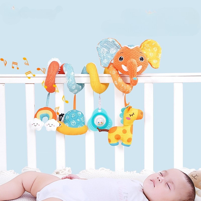Einfach um Stäbe oder Griffe wickeln – ganz ohne Klett oder Knöpfe. Die weiche Spirale bleibt sicher an Ort und Stelle. Hängende Tierfreunde, kleine Rasseln und sanfte Geräusche regen Babys Sinne an und fördern motorische Fähigkeiten – ganz spielerisch.