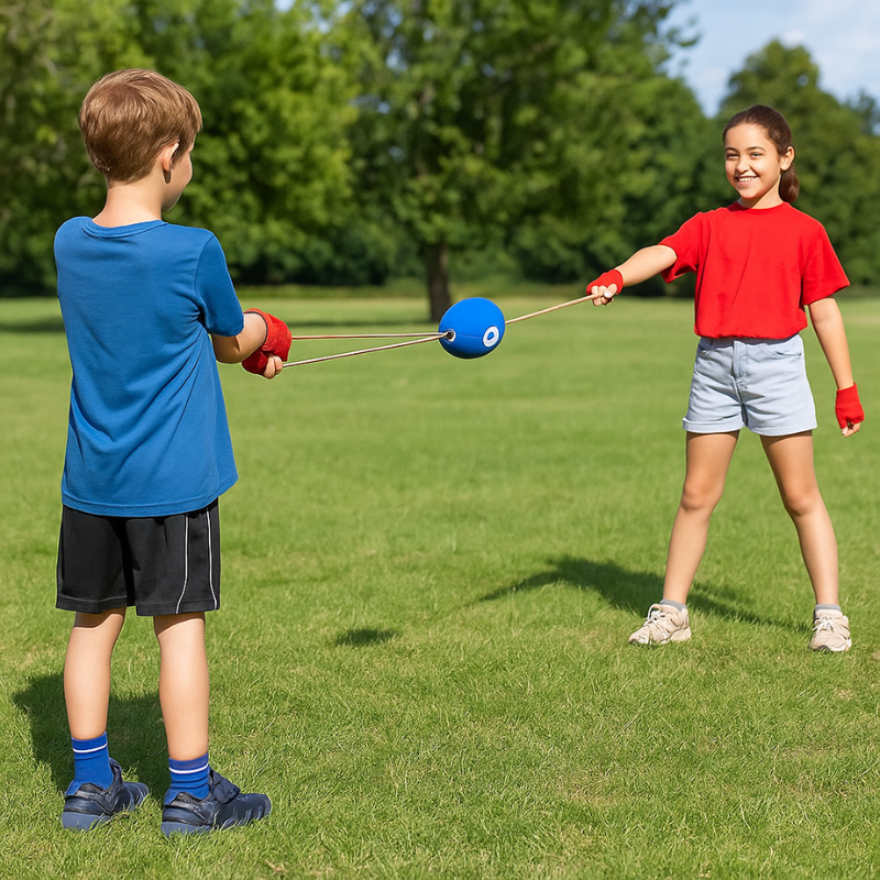 Ob zu Hause im Garten oder unterwegs im Park – ZippZapp lässt sich überall aufbauen. Zwei Kinder stehen sich gegenüber, halten die Griffe fest und ziehen abwechselnd, um das Spielgerät blitzschnell hin und her zu schicken. Je kräftiger der Zug, desto schneller der Flug – das bringt Bewegung, fördert Reaktion und macht richtig Spaß.