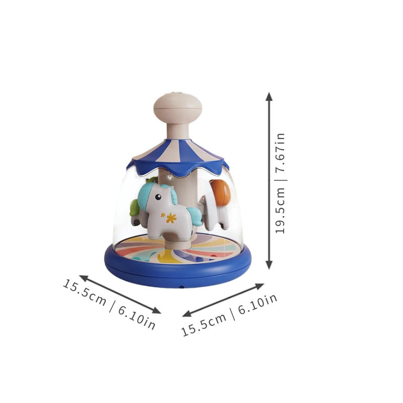 Ein leichter Druck genügt – schon beginnt das Karussell sich zu drehen. Die bunten Pferde wirbeln fröhlich im Kreis, während die Basis sanft wackelt. Babys werden ermutigt zu greifen, zu drücken und zu entdecken – ganz ohne Überreizung, aber mit viel Spaß und Interaktion.