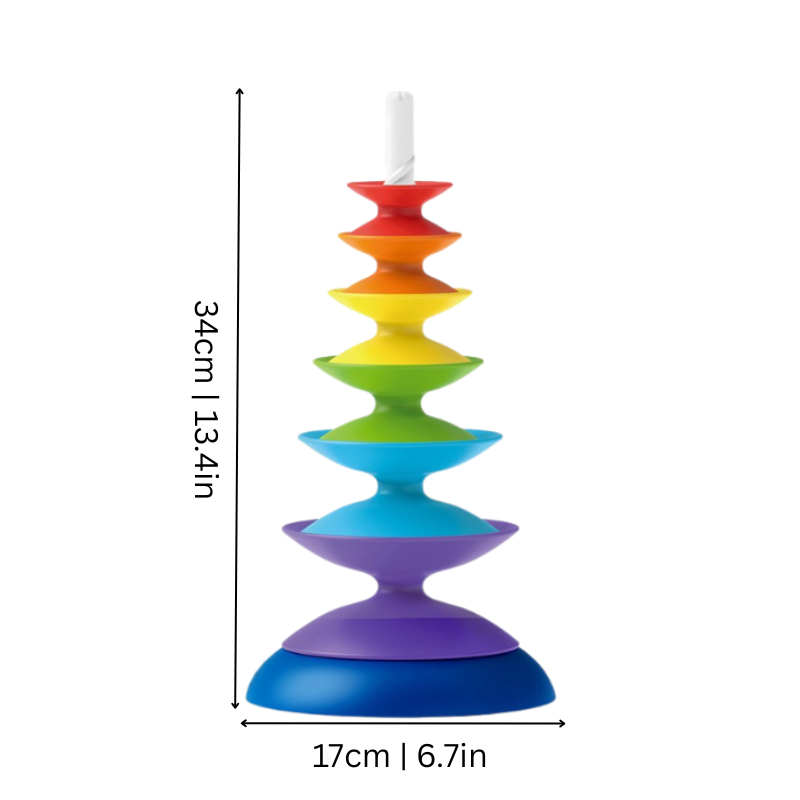 Diese Ringe sind mehr als nur hübsch: Ihre glatte Oberfläche und das leichte Design machen sie ideal für kleine Hände zum Greifen, Stapeln und Erkunden. Drehen, drehen lassen oder umstoßen – jede Bewegung fördert Koordination und Motorik, ganz ohne Batterien oder Bildschirme.